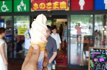 ツーリング途中休憩で仁木町のきのこ王国へ。この日は暑かったのできのこ汁ではなく、新商品の「さくらんぼソフト」を購入!